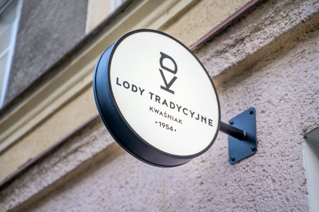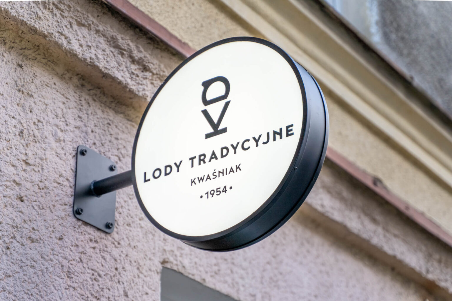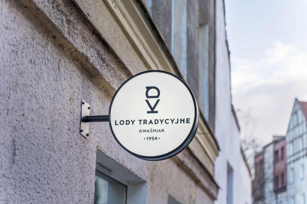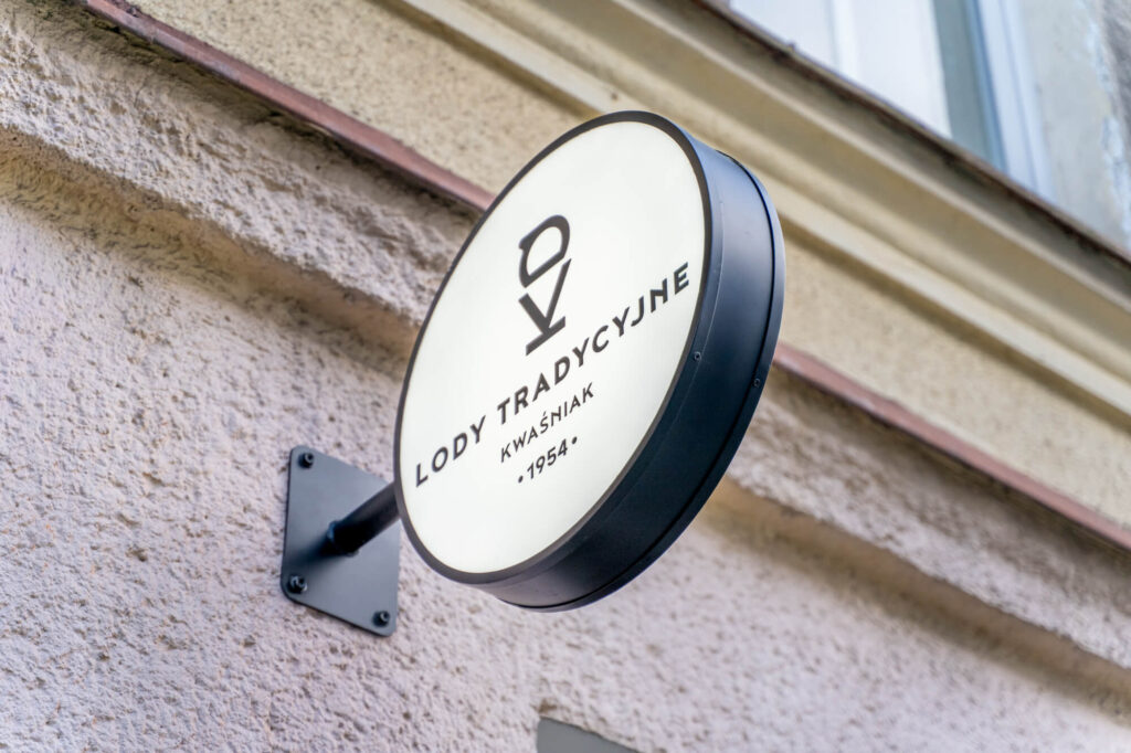 Zrealizowaliśmy projekt stylowego oznakowania dla lokalu Lody Tradycyjne Kwaśniak. Naszym celem było stworzenie reklamy, która nawiąże do wieloletniej tradycji marki, a jednocześnie zachowa nowoczesny i estetyczny charakter. Wybór padł na semafor reklamowy (kaseton dwustronny) w kształcie koła. Jest to rozwiązanie, które doskonale sprawdza się w ciasnej zabudowie miejskiej, zapewniając widoczność lokalu dla przechodniów nadchodzących z obu stron ulicy, nie zaburzając przy tym architektury budynku.
